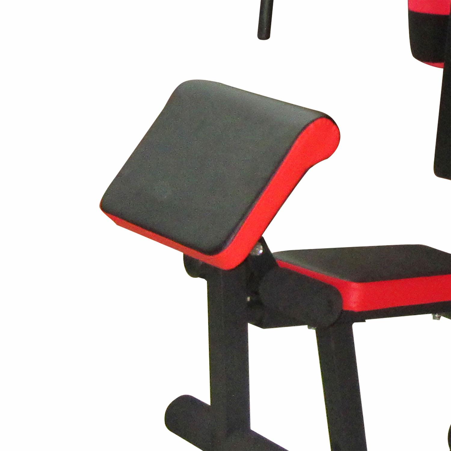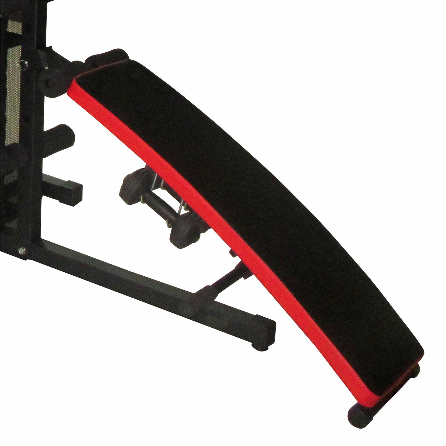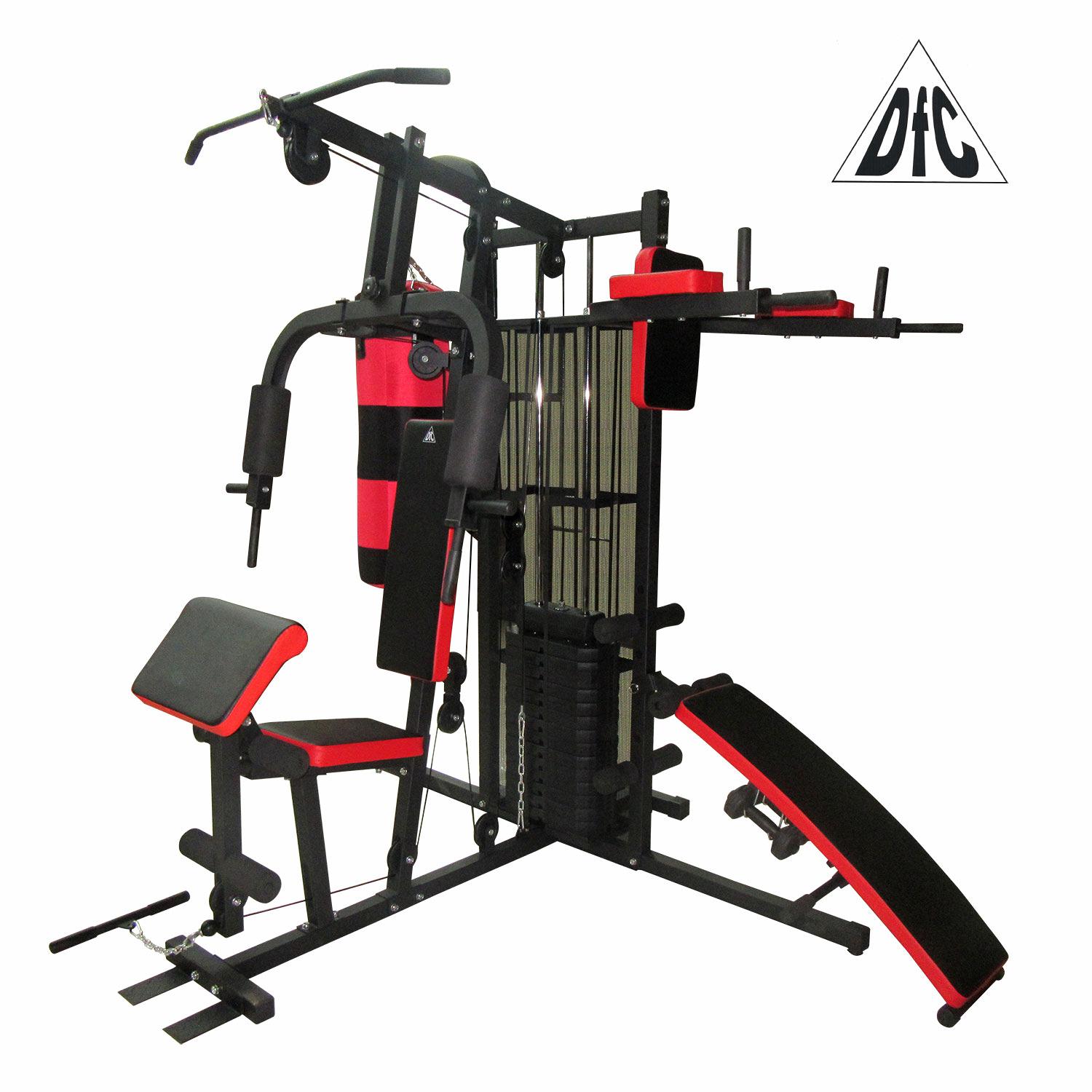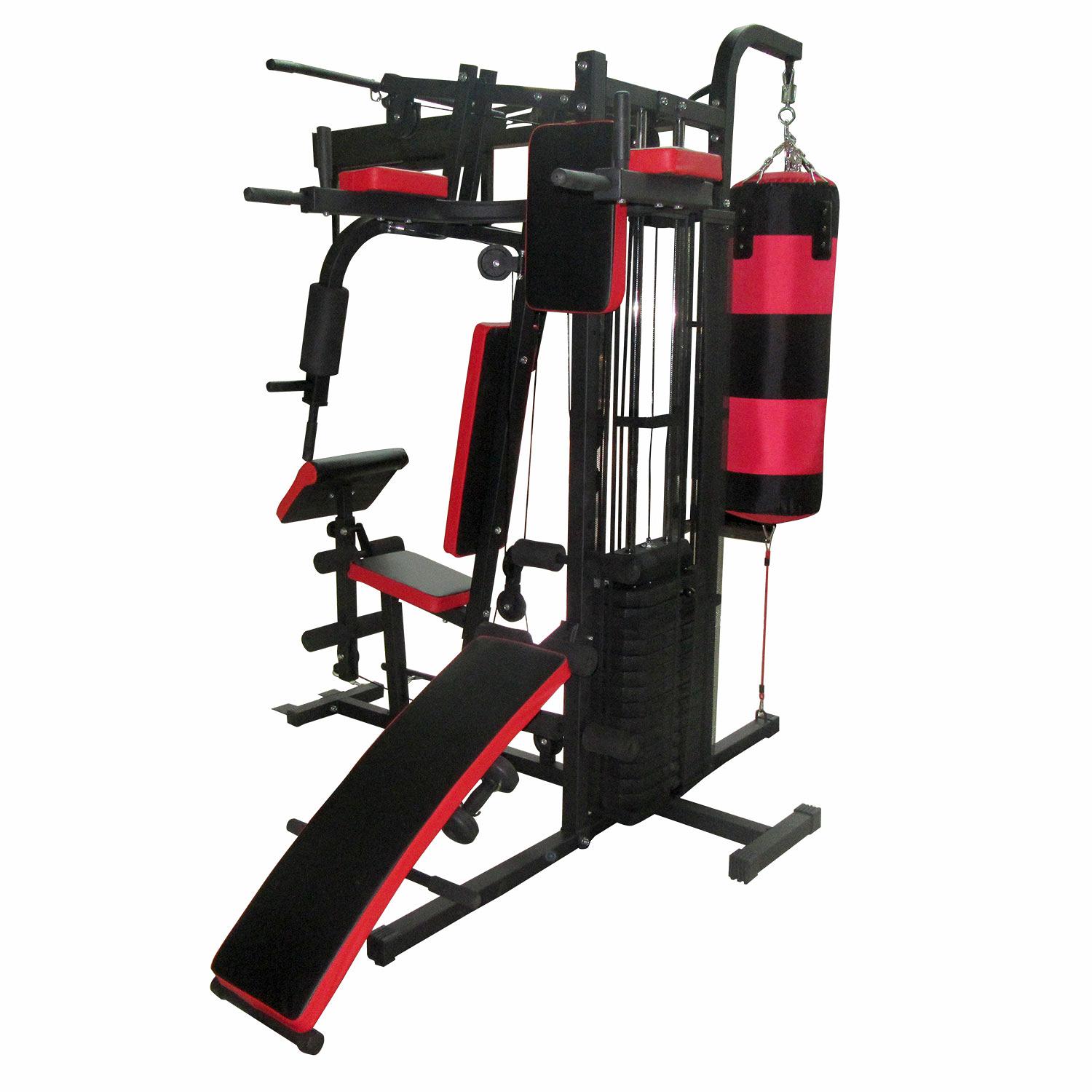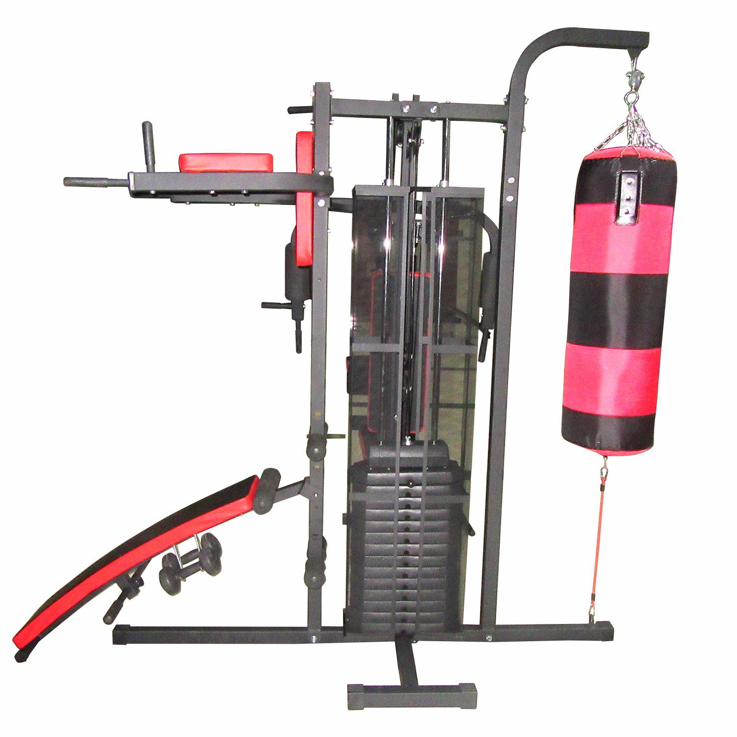 Многофункциональный силовой тренажер (мультистанция) с встроенным весовым стеком 68 кг. Позволяет выполнять комплекс упражнений на различные группы мышц. Дополнительно тренажер имеет брусья для отжимания, скамью для пресса с гантелями по 1,5 кг с регулировкой по углу наклона, боксерский мешок.